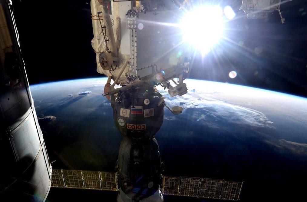 Διαστημική ανατολή Ηλίου πάνω από το ρωσικό Σογιούζ (Soyuz).