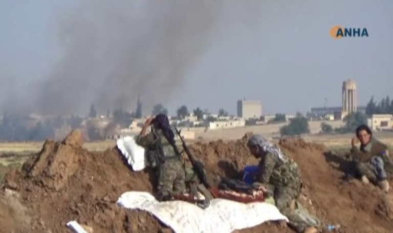 Σε εικόνες που ανάρτησε στο Twitter το κουρδικό πρακτορείο ANHA βλέπουμε τις κουρδικές δυνάμεις σε απόσταση αναπνοής από την Τελ Αμπιάντ να σφυροκοπούν τους ταμπουρωμένους τζιχαντιστές.