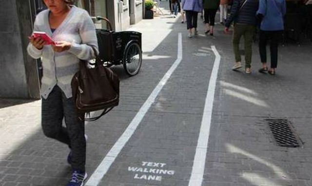 Σε μια όμως άλλη κοινωνία, μάλλον πιο εξελιγμένη (;) υπάρχουν πλέον και ειδικές λωρίδες για όσους περπατούν και γράφουν μηνύματα στο κινητό τους!