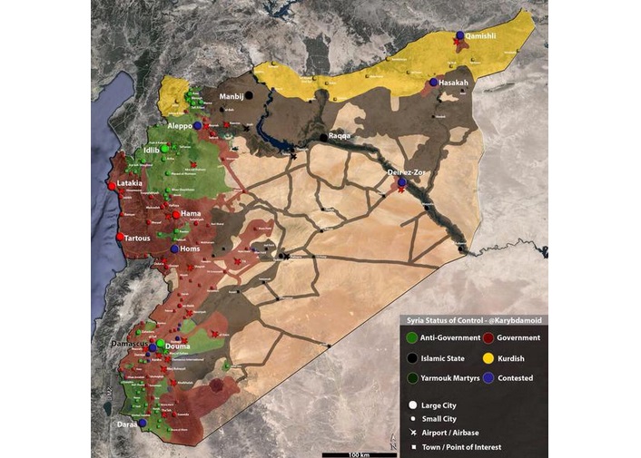 Το Ισλαμικό Κράτος κατέχει αναμφισβήτητα το μεγαλύτερο μέρος της χώρας, αλλά αυτό είναι έρημος. Σε κατοικημένες περιοχές βρίσκεται περίπου στα ίδια με τα κυβερνητικά εδάφη.