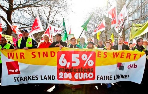Περισσότεροι από 100.000 εργαζόμενοι στο δημόσιο τομέα της Γερμανίας πραγματοποιούν προειδοποιητικές απεργίες από τις αρχές της εβδομάδας διεκδικώντας αύξηση των μισθών τους, σύμφωνα με τα στοιχεία που έδωσε στη δημοσιότητα η συνδικαλιστική οργάνωση των εργαζομένων.