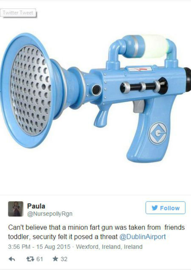 Ένα τέτοιο περιστατικό σημειώθηκε στο Δουβλίνο, όπου οι αρχές κατάσχεσαν ένα παιδικό πιστολάκι εμπνευσμένο από την ταινία Minions, η μοναδική λειτουργία του οποίου είναι να…μιμείται τον ήχο που βγάζει κάποιος όταν αερίζεται.