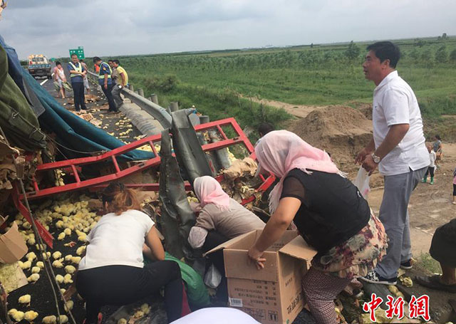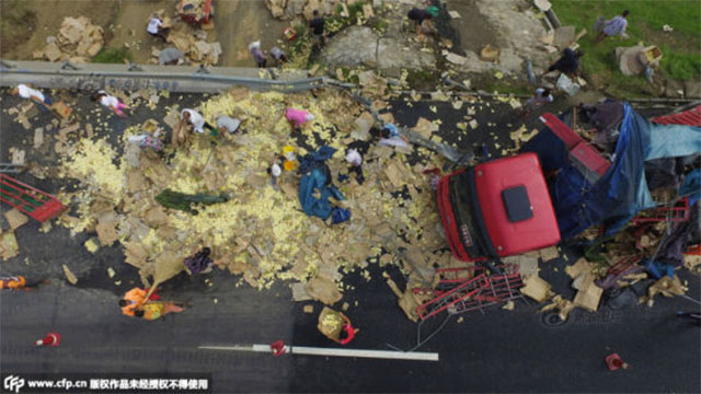 Αλλά η “χαρά” τους δεν κράτησε πολύ, αφού δεκάδες χωρικοί έσπευσαν να τα μαζέψουν, σε ένα από τα πιο “θορυβώδη” τροχαία που συνέβησαν ποτέ στην Κίνα.