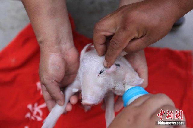 Το γουρουνάκι δεν μπορεί να σταθεί εύκολα στα πόδια του, γιατί το διπλό του κεφάλι είναι πολύ βαρύ. Ο Γιανγκ αγόρασε ένα μπιμπερό για να το ταΐζει.