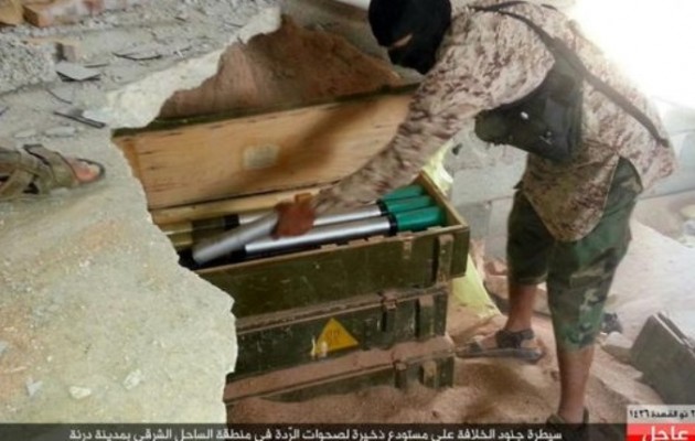 Το Ισλαμικό Κράτος με φωτογραφίες που ανάρτησε στο Twitter φαίνεται να κατέλαβε μια αποθήκη πυρομαχικών στην πόλη Ντέρνα της Λιβύης.