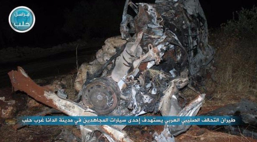 Η Αλ Κάιντα ανήρτησε στο Twitter μια φωτογραφία που εικονίζει ένα κατεστραμμένο όχημα και ανέφερε ότι επλήγη από πύραυλο του «συνασπισμού των σταυροφόρων και των Αράβων» στο Αλ Ντάνα, δυτικά του Χαλεπιού.