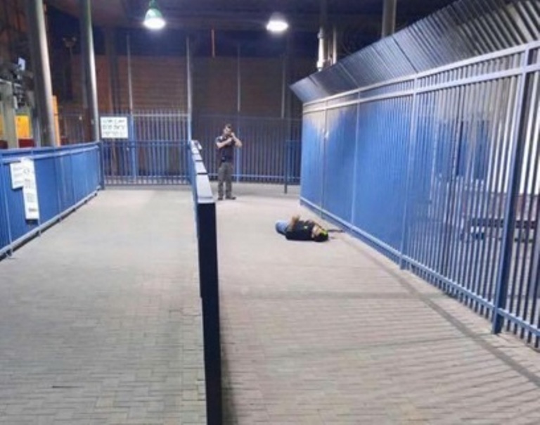 Στο έδαφος κείτεται, αφού έχει δεχτεί πυρά από Ισραηλινούς στρατιώτες, ένας Παλαιστίνιος τζιχαντιστής που αποπειράθηκε το Σάββατο το βράδυ να μαχαιρώσει έναν Ισραηλινό στρατιώτη στην Καλάντια, στη βορειοανατολική Ιερουσαλήμ.