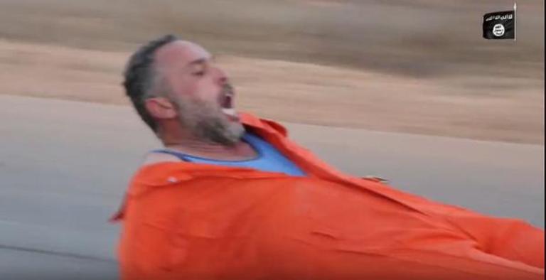 Στη δεύτερη σειρά φωτογραφιών, ο άλλος μελλοθάνατος δέθηκε πίσω από ένα TOYOTA των τζιχαντιστών και τον έσυραν στην άσφαλτο μέχρι να ξεψυχήσει.