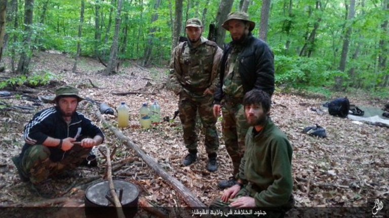 Οι τζιχαντιστές, προφανώς Τσετσένοι, ποζάρουν μέσα σε ένα δάσος όπου έχουν προσωρινά στρατοπεδεύσει. Πρόκειται για την πρώτη φορά που τζιχαντιστές από το Ισλαμικό Κράτος ξεκινάνε επισήμως τζιχάντ σε ρωσικό έδαφος και φωτογραφίζονται με ακάλυπτα πρόσωπα, προκαλώντας ευθέως τον Βλάντιμιρ Πούτιν.