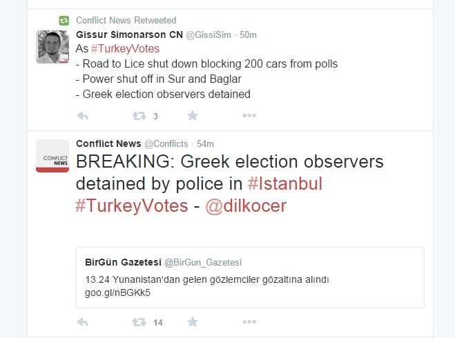“Δεν υπάρχουν διαπιστευμένοι Έλληνες παρατηρητές. Τρεις που ιδίοις πρωτοβουλία πήγαν Κωνσταντινούπολη απομακρύνθηκαν χωρίς σύλληψη”.
