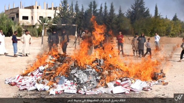 Το Ισλαμικό Κράτος νοιάζεται για την υγεία των υποτελών του, για αυτό και όχι μόνο απαγορεύει δια ροπάλου το κάπνισμα, αλλά και όταν βρίσκει φορτία με τσιγάρα τα καίει.