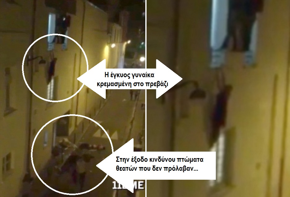 Στο βίντεο που δημοσιεύουμε θα παρακολουθήσετε την τρομακτική στιγμή που μια έγκυος γυναίκα κρεμόταν από το πρεβάζι παραθύρου στον δεύτερο όροφο του θεάτρου Μπατακλάν (Bataclan) στο Παρίσι, σε μια απέλπιδα προσπάθεια να γλιτώσει τη ζωή της και τη ζωή του αγέννητου μωρού της από τους ισλαμοφασίστες της οργάνωσης Ισλαμικό Κράτος που έσφαζαν τους θεατές της συναυλίας.