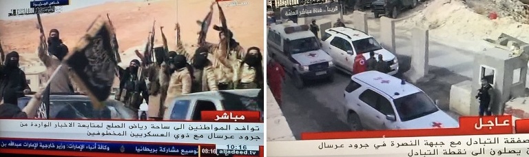 Δείτε πλάνο της τοπικής τηλεόρασης: Αριστερά ένας τζιχαντιστής φυλακισμένος, δεξιά ένας Λιβανέζος όμηρος.