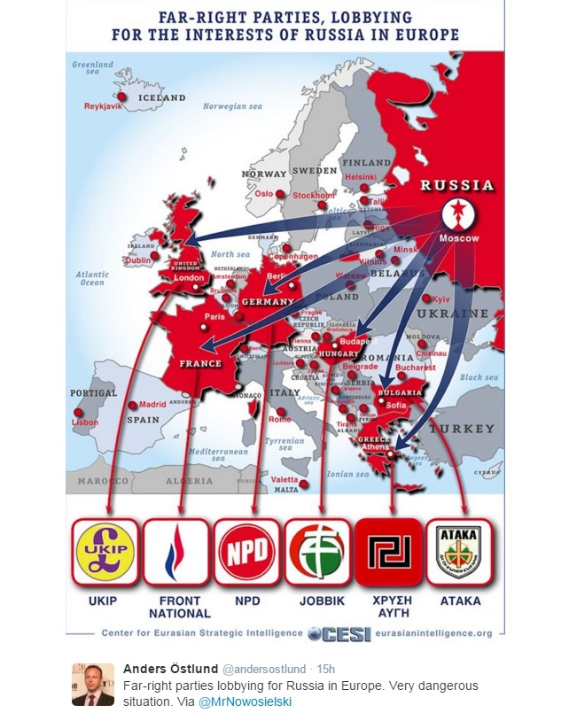 Το Κέντρο Ευρασιατικών Στρατηγικών Πληροφοριών (Center for Eurasian Strategic Intelligence – CESI), μια ΜΚΟ που εδρεύει στο Λονδίνο και ιδρύθηκε το 2014 με αντικείμενό της την επικέντρωση στη ρωσική πολιτική, δημοσίευσε ένα γράφημα που συνδέει την ευρωπαϊκή ακροδεξιά με τη Ρωσία.
