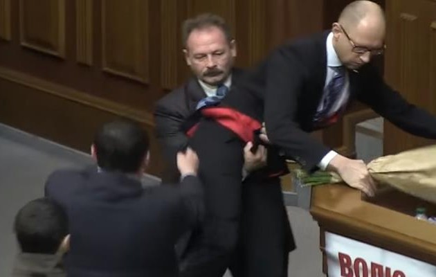 Ένας βουλευτής της αντιπολίτευσης, ο Όλεγκ Μπάρνα, προσέφερε στον πρωθυπουργό της Ουκρανίας, Αρσένι Γιάτσενιουκ λουλούδια και στη συνέχεια τον έπιασε από τη μέση, τον σήκωσε και τον έδιωξε κακήν κακώς.