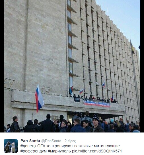 Αν και απωθήθηκαν από την αστυνομία, περίπου 50 ρωσόφωνοι κατάφεραν να μπουν στο κτίριο, να κατεβάσουν την ουκρανική σημαία και να υψώσουν στη θέση της τη ρωσική, όπως βλέπετε και στη φωτογραφία που ανέβηκε στο twitter.