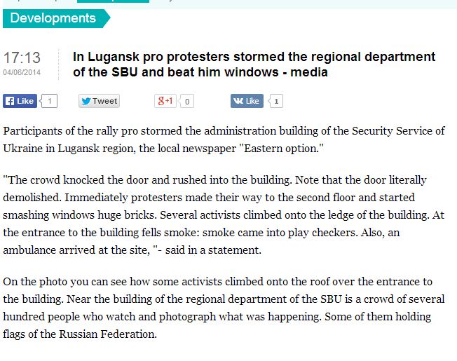 “Το πλήθος έσπασε την πόρτα και εισέβαλε στο κτίριο. Ανέβηκαν γρήορα στον δεύτερο όροφο και έσπαγαν τις πόρτες με τούβλα. Στη συνέχεια πήγαν στην κορυφή του κτιρίου με ρώσικες σημαίες” μετέδωσε πριν από λίγο το ουκρανικό δίκτυο Ιντερφάξ.