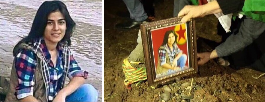 Σουλτάν Ιρμάκ, 16 χρονών, προφανώς μέλος της κουρδικής νεολαίας και ίσως της πολιτοφυλακής YPS. Κατέφυγε τραυματισμένη σε ένα υπόγειο, όπου κάηκε ζωντανή. Δεξιά η φωτογραφία είναι από τον τάφο της.
