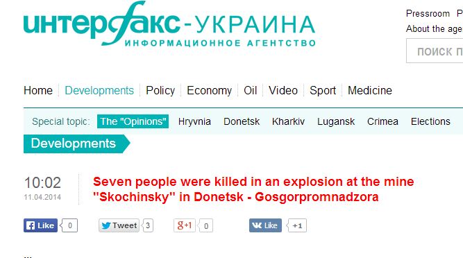 Μεγάλη έκρηξη σημειώθηκε στο μεταλλείο Skochinsky στο Ντονέτσκ με αποτέλεσμα τουλάχιστον 7 εργαζόμενοι να χάσουν την ζωή τους μετέδωσε πριν από λίγο με έκτακτο τηλεγράφημα το ουκρανικό πρακτορείο Ιντερφάξ χωρίς να δοθούν περισσότερες πληροφορίες.