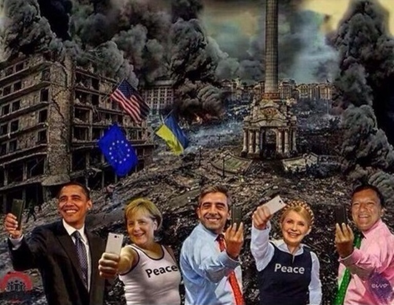 Το έξυπνο φωτομοντάζ κυκλοφορεί στο twitter, παγκοσμίως, και δείχνει τους δυτικούς και φιλοδυτικούς, κάποιοι μάλιστα φοράνε μπλουζάκια που γράφουν Peace (Ειρήνη), να τραβάνε selfie φωτογραφίες με φόντο τα ερείπια του Κιέβου.