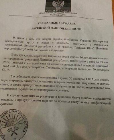 Σύμφωνα με την αρχική είδηση οι αρχές του Ντονέτσκ υποτίθεται ότι έστειλαν έγγραφο σε όλους τους Εβραίους να απογραφούν στις νέες φιλορωσικές αρχές.