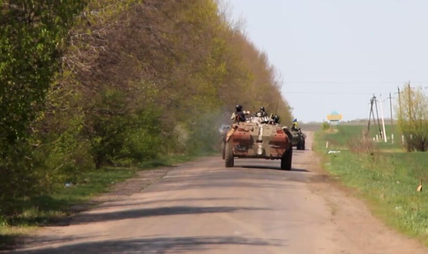 Ουκρανικά τεθωρακισμένα κινούνται με μεγάλη ταχύτητα σε επαρχιακό δρόμο έξω από την πόλη, μετά την επίθεση στο σημείο ελέγχου.