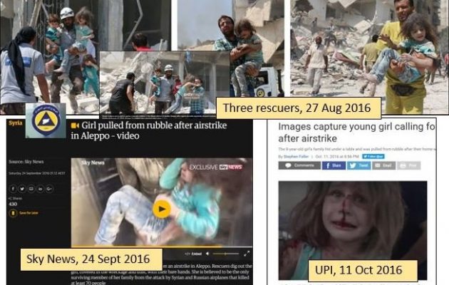 Αυτό σημαίνει δύο πράγματα. Ή το συγκεκριμένο παιδί αποτελεί “στόχο” των βομβαρδιστικών, τα οποία έχουν βαλθεί να το εξοντώσουν αλλά πάντα στο τέλος… σώνεται, ή πρόκειται απλά για ένα ακόμα παιδί-ηθοποιό που χρησιμοποιούν τα “Λευκά Κράνη” για την προπαγάνδα τους.