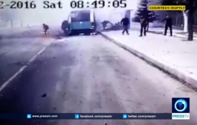 Στο βίντεο φαίνεται η στιγμή που σημειώνεται η έκρηξη σε παγιδευμένο αυτοκίνητο, ακριβώς δίπλα από το λεωφορείο το οποίο μετέφερε τους Τούρκους στρατιώτες.