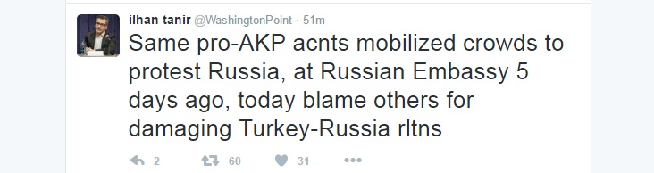 Σύμφωνα με τον Τούρκο δημοσιογράφο Ιλχάν Τανίρ, οι ίδιοι λογαριασμοί στο Twitter (τρολ) του Ερντογάν που μέχρι πριν πέντε ημέρες προπαγάνδιζαν διαδικτυακά την αντιρωσική διαδήλωση έξω από την Πρεσβεία της Ρωσίας στην Άγκυρα, σε ένδειξη αλληλεγγύης στους ισλαμιστές του Χαλεπιού, μετά τη δολοφονία του Ρώσου Πρέσβη τη Δευτέρα κατηγορούν άλλους ότι επιχειρούν να χαλάσουν την επαναπροσέγγιση Άγκυρας-Μόσχας.