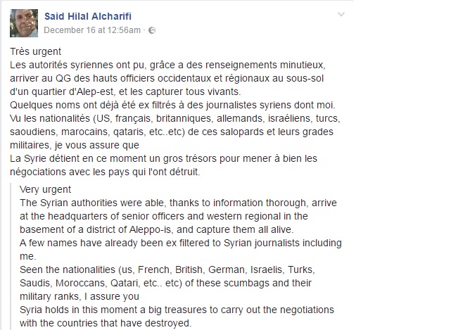Ο πρέσβης της Συρίας στα Ηνωμένα Έθνη, Μπασάρ Τζαφάρι, σε δηλώσεις του σε δημοσιογράφους κατήγγειλε ότι στις συνοικίες που ήταν ταμπουρωμένοι οι τζιχαντιστές στο νοτιοανατολικό Χαλέπι κρύβονται μια σειρά από πράκτορες δυτικών συμφερόντων, μεταξύ των οποίων ένας Αμερικανός, ένας Ισραηλινός, ένας Τούρκος και πολλοί Σαουδάραβες.
