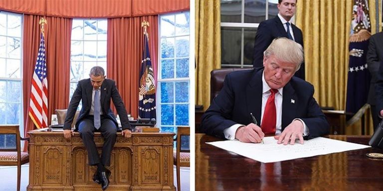 Έτσι λοιπόν, την Παρασκευή, αμέσως μετά την ορκωμοσία του, ο Αμερικανός πρόεδρος φρόντισε να κάνει την πρώτη αλλαγή στο οβάλ γραφείο, αντικαθιστώντας τις βυσσινί κουρτίνες του Μπαράκ Ομπάμα με νέες κουρτίνες, χρυσαφί χρώματος.