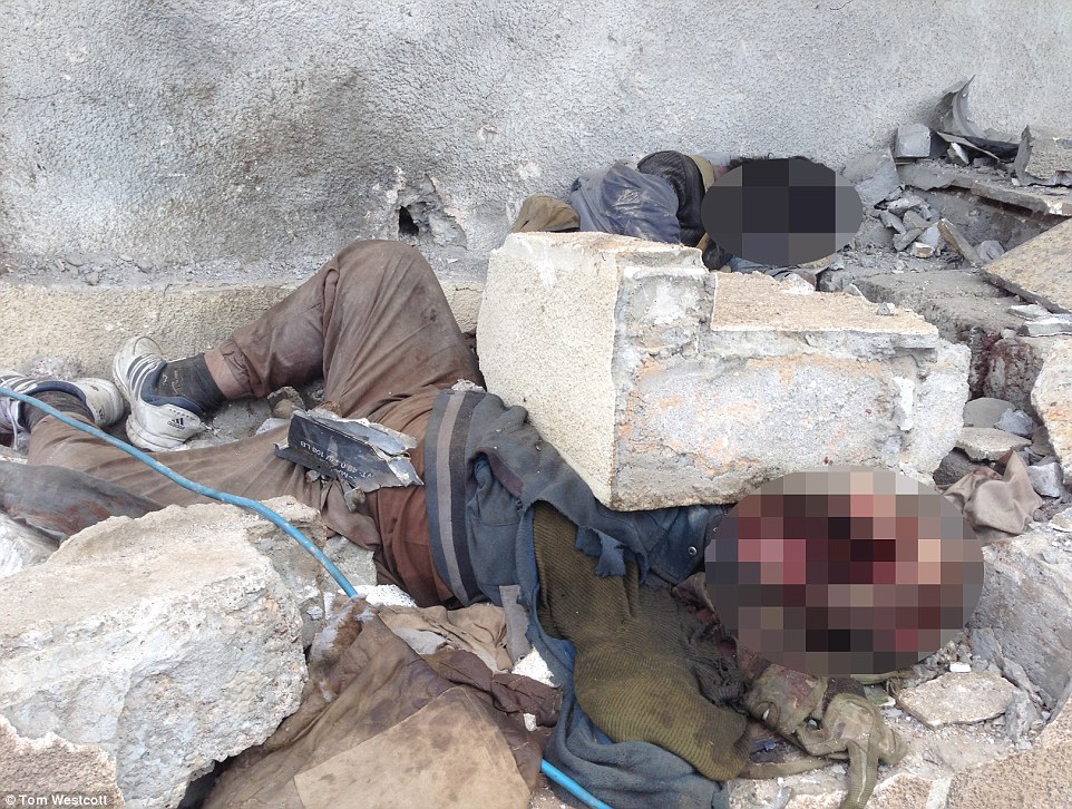 Πτώματα πεταμένα στην άσφαλτο, σε συντρίμμια, μπροστά σε πάγκους.