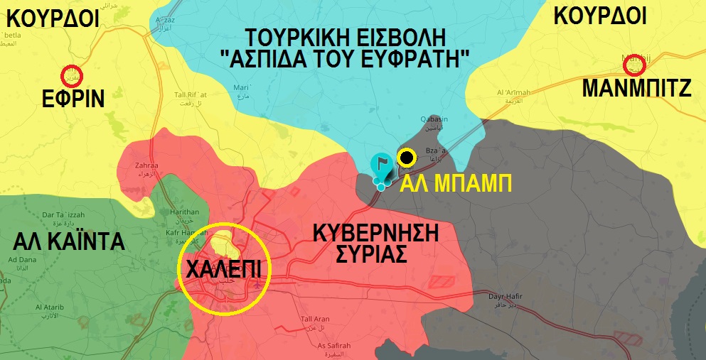 Η πόλη Αλ Μπαμπ είναι σημειωμένη με μαύρη βούλα και κίτρινο περίγραμμα. Το μαύρο χρώμα είναι το έδαφος που ελέγχει το Ισλαμικό Κράτος. Όπως βλέπετε η τουρκική εισβολή “κατεβαίνει” από τα βόρεια και οι Τούρκοι με τους μισθοφόρους τους προωθούνται δυτικά της πόλης προς τις κυβερνητικές δυνάμεις. Προσπαθούν δηλαδή οι Τούρκοι να μπουν εμπόδιο στον στρατό της Συρίας να προχωρήσει προς την Αλ Μπαμπ. Αυτό ίσως και να προκαλέσει πολεμική σύγκρουση.