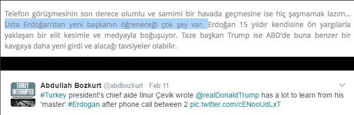 Ο Τούρκος δημοσιογράφος Ιλνούρ Τσεβίκ (İlnur Çevik), ένας εκ των κορυφαίων συμβούλων του Ρετζέπ Ταγίπ Ερντογάν, έγραψε ότι ο Ντόναλντ Τραμπ “έχει πολλά να μάθει από τον αφέντη του Ρετζέπ Ταγίπ Ερντογάν ύστερα από την τηλεφωνική συνομιλία των δύο”.