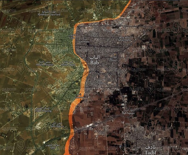 Χάρτης της πολιορκίας της Αλ Μπαμπ. Οι Τούρκοι (πράσινο χρώμα) έχουν εισέλθει στην πόλη από τα δυτικά και ελέγχουν περίπου το 1/3.