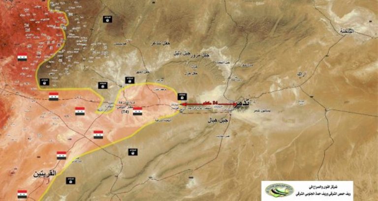 Ο στρατός υποστηρίζεται από πολεμικά αεροπλάνα που σφυροκοπούν τους τρομοκράτες που κινούνται στην έρημο δυτικά της Παλμύρας.