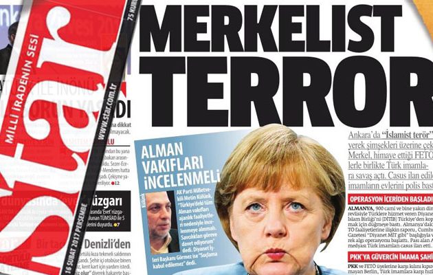 Επίθεση στην Άνγκελα Μέρκελ εξαπέλυσε η ερντογανική ημερήσια εφημερίδα Star την Πέμπτη με τον πρωτοσέλιδο τίτλο “Μερκελιστικός Τρόμος”, κατακρίνοντας τις έρευνες της γερμανικής Αστυνομίας σε Τούρκους ιμάμηδες που θεωρούνται ύποπτοι ότι κατασκόπευαν Τούρκους της Γερμανίας που θεωρούνται αντικαθεστωτικοί.