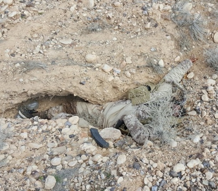 Νεκρός τζιχαντιστής στο όρυγμά του στα βουνά πάνω από την Παλμύρα.