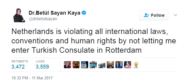 Η Τουρκάλα υπουργός Φάτμα Μπετούλ Σαγιάν Καγιά, που βρισκόταν στη Γερμανία και διατάχθηκε από τον Ερντογάν να εισέλθει οδικώς στην Ολλανδία, ύστερα από την απαγόρευση εισόδου στη χώρα του Μεβλούτ Τσαβούσογλου από την ολλανδική κυβέρνηση, έγραψε στο Twitter ότι η Ολλανδία παραβιάζει όλους τους διεθνείς νόμους, συνθήκες και ανθρώπινα δικαιώματα με το να μην της επιτρέπει να εισέλθει στο τουρκικό Προξενείο στο Ρότερνταμ.