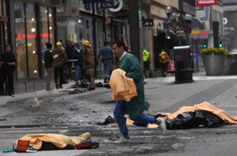 Εικόνες που μετέδωσαν σουηδικοί τηλεοπτικοί σταθμοί εικονίζουν ένα φορτηγό που εν μέρει έχει μπει μέσα στο πλαϊνό μέρος του πολυκαταστήματος Ahlens, στο κέντρο της Στοκχόλμης και μορφές που μοιάζουν με ανθρώπινες σορούς να έχουν καλυφθεί με κουβέρτες.