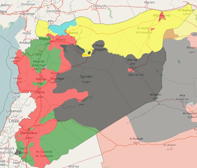 Πολεμικός χάρτης της Συρίας. Με γαλάζιο χρώμα απεικονίζονται τα εδάφη που τελούν υπό τουρκική κατοχή. Με κίτρινο χρώμα είναι τα εδάφη που ελέγχουν οι Κούρδοι και οι σύμμαχοί τους. Με πράσινο χρώμα είναι η Αλ Κάιντα και ο Ελεύθερος Συριακός Στρατός (FSA), που τους ονομάζουν σε άλλες ιστοσελίδες “μετριοπαθείς αντάρτες”. Με κόκκινο χρώμα είναι η κυβέρνηση και με μαύρο το Ισλαμικό Κράτος.