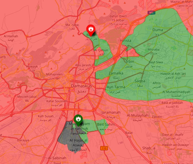 Πολεμικός χάρτης της Δαμασκού, πρωτεύουσας της Συρίας. Με κόκκινο χρώμα είναι οι περιοχές που ελέγχει η κυβέρνηση, με πράσινο η Αλ Κάιντα και ο Ελεύθερος Συριακός Στρατός (FSA) με μαύρο το Ισλαμικό Κράτος. Η κόκκινη “πινέζα-φωτιά” δείχνει το σημείο που γίνονται μάχες στη συνοικία Αλ Καμπούν, ενώ η πράσινη “πινέζα-φωτιά” δείχνει τις πρόσφατες συγκρούσεις μεταξύ Ισλαμικού Κράτους και αντίπαλων ισλαμιστικών οργανώσεων. Όπως μπορείτε να δείτε, οι τρομοκράτες συνεχίζουν και ελέγχουν μεγάλο μέρος των ανατολικών προαστίων της πρωτεύουσας.