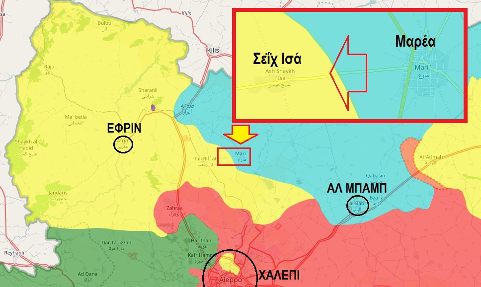 Πολεμικός χάρτης της βορειοδυτικής Συρίας, βόρεια της επαρχίας του Χαλεπιού. Με κίτρινο χρώμα είναι τα εδάφη υπό κουρδικό έλεγχο, με μπλε τα εδάφη που κατέλαβε η Τουρκία, με κόκκινο η συριακή κυβέρνηση και με πράσινο η Αλ Κάιντα μαζί με τους “μετριοπαθείς” ισλαμιστές. Το κίτρινο βέλος δείχνει στον χάρτη το σημείο που δόθηκε η μάχη και μέσα στο κόκκινο πλαίσιο το πεδίο της μάχης μεταξύ των πόλεων Σεΐχ Ισά και Μαρέα.