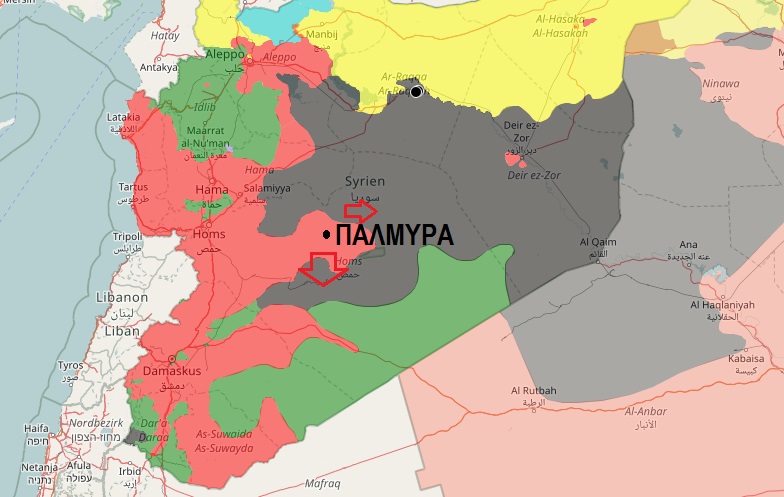 Τα κόκκινα βέλη στον χάρτη δείχνουν την προέλαση του συριακού στρατού νότια και ανατολικά της Παλμύρας: