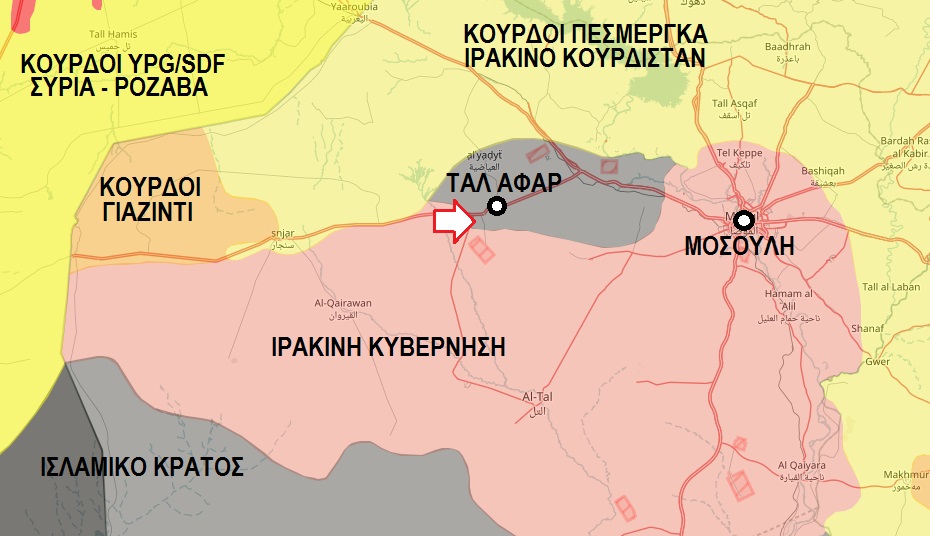 Το κόκκινο βέλος δείχνει το πιο κοντινό σημείο που έχουν πλησιάσει οι ιρακινές πολιτοφυλακές δυτικά στην Ταλ Αφάρ. Ο ιρακινός τακτικός στρατός προελαύνει από τα ανατολικά, δηλαδή από τη μεριά της Μοσούλης.