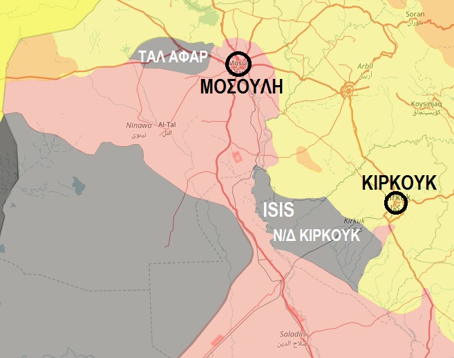 Στον χάρτη βλέπετε τους δύο θύλακες της οργάνωσης Ισλαμικό Κράτος στο βόρειο Ιράκ. Ο θύλακας της Ταλ Αφάρ, δυτικά της Μοσούλης, και ο θύλακας του νοτιοδυτικού Κιρκούκ, νοτιοδυτικά της πόλης Κιρκούκ. Με κίτρινο χρώμα είναι τα εδάφη που ελέγχουν οι Κούρδοι και με κόκκινο η ιρακινή κυβέρνηση.