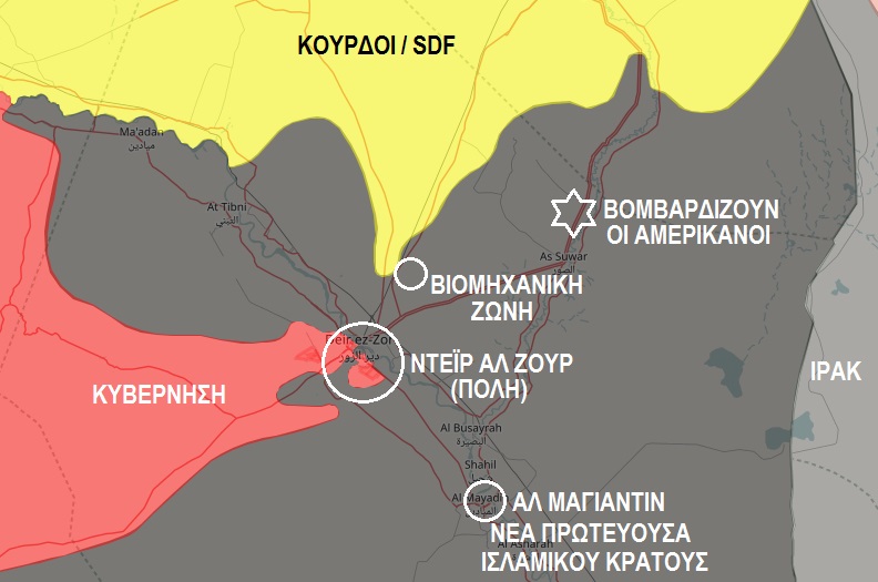 Στον πολεμικό χάρτη που ακολουθεί βλέπετε την εξέλιξη της μάχης στην ανατολική Συρία, γύρω από την πόλη Ντέιρ Αλ Ζουρ.