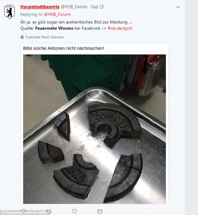 Οι υπεύθυνοι μάλιστα αναγκάστηκαν να καλέσουν την πυροσβεστική καθώς άρχισε να καλεί σε βοήθεια, η οποία τελικά έκοψε τα βάρη σε μικρά κομμάτια για να απεγκλωβίσει το μόριο του.