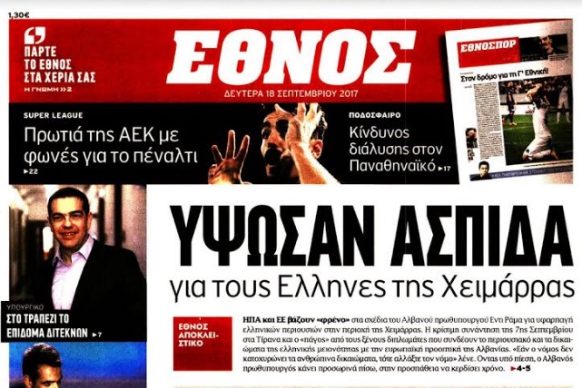 Το πρωτοσέλιδο της εφημερίδας Έθνος τη Δευτέρα με το ρεποράζ για τη Χειμάρρα.