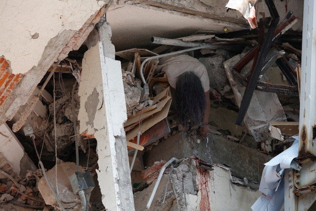 Εκατοντάδες μέλη των υπηρεσιών άμεσης βοήθειας και πολίτες που έσπευσαν να βοηθήσουν εθελοντικά ψάχνουν στα συντρίμμια με αξίνες, φτυάρια και γυμνά τους χέρια.